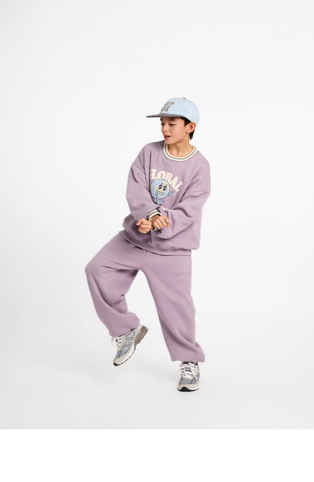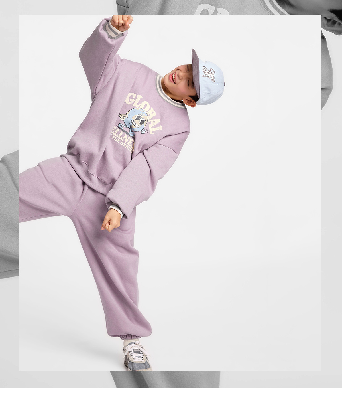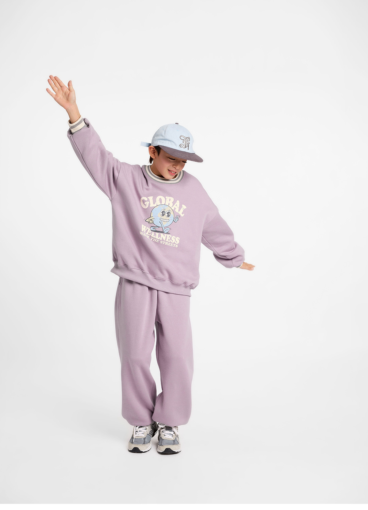 은은한 라벤더 컬러가 돋보이는 맨투맨과 조거팬츠 구성의 상하셋업이에요.