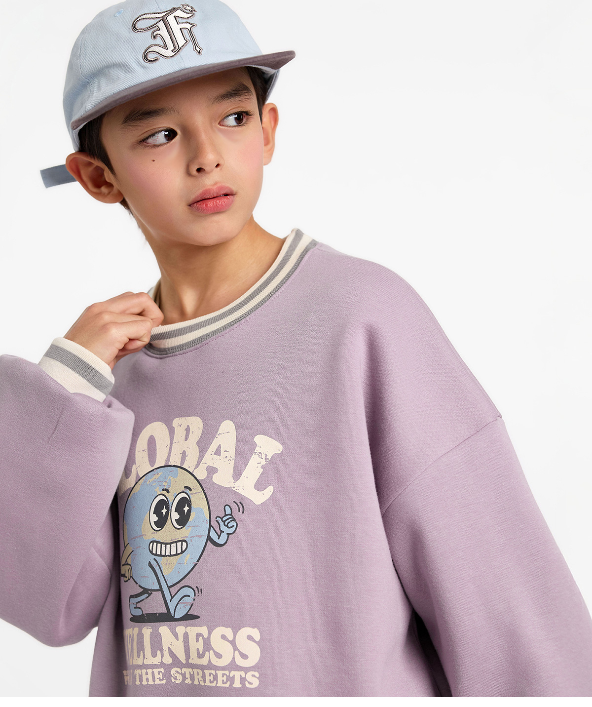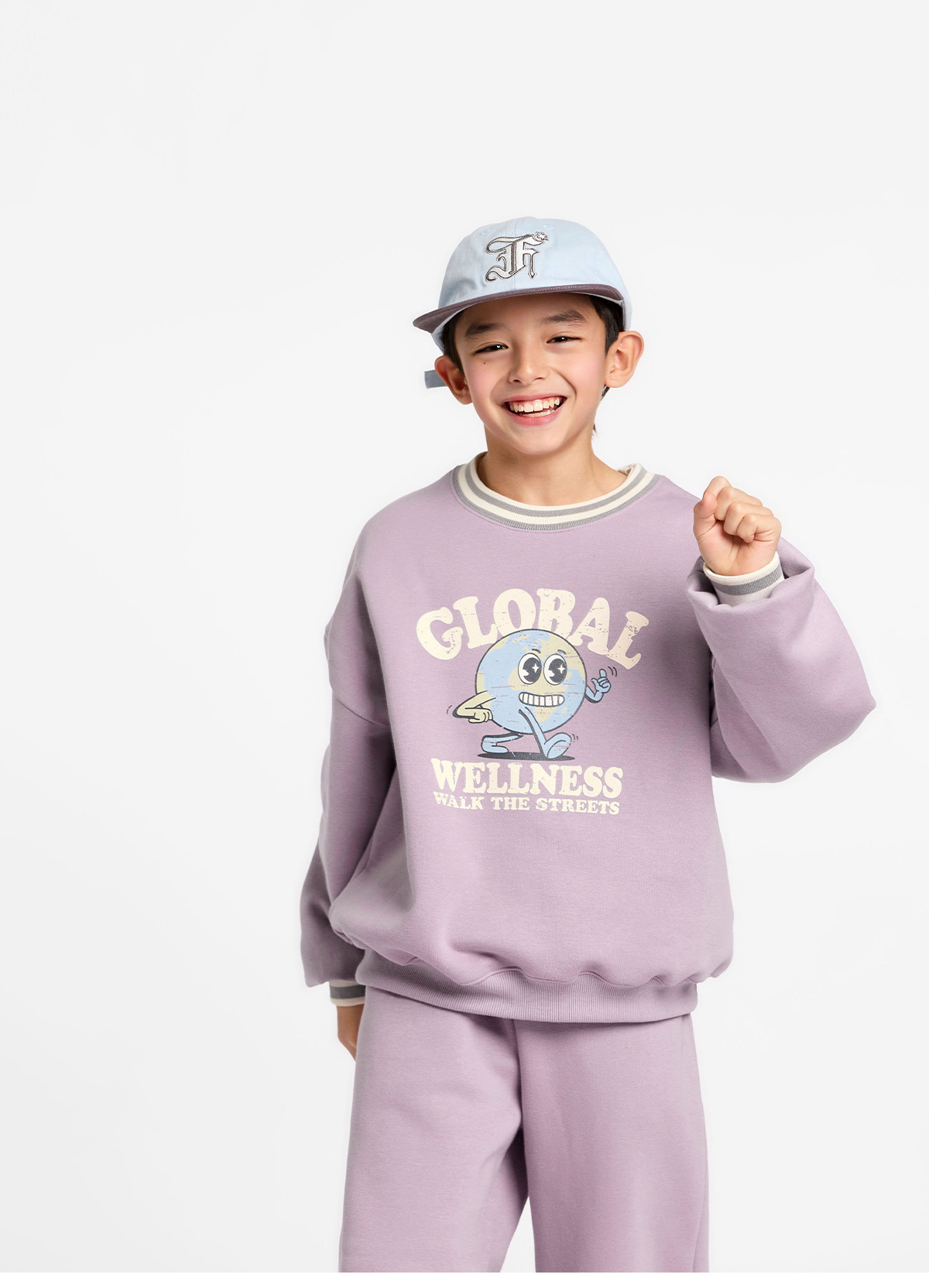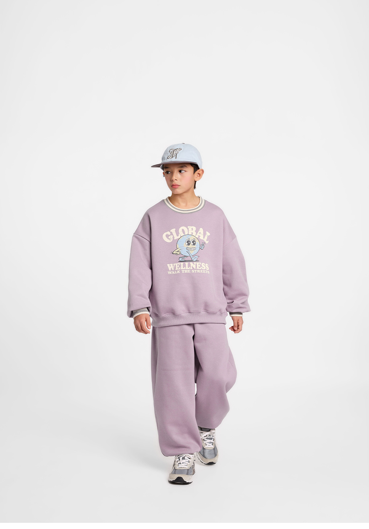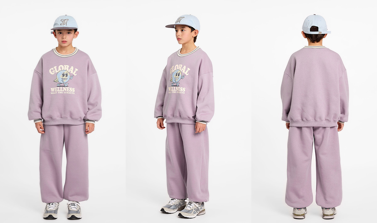 은은한 라벤더 컬러가 돋보이는 맨투맨과 조거팬츠 구성의 상하셋업이에요.