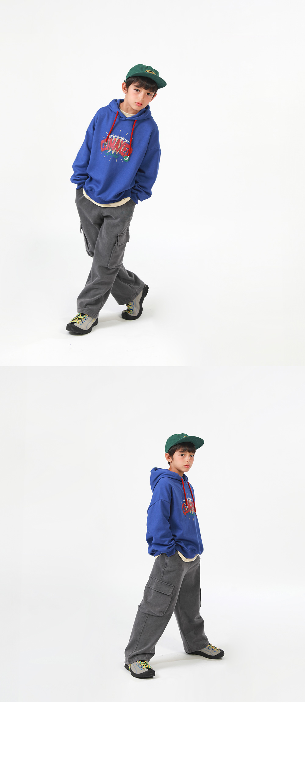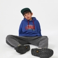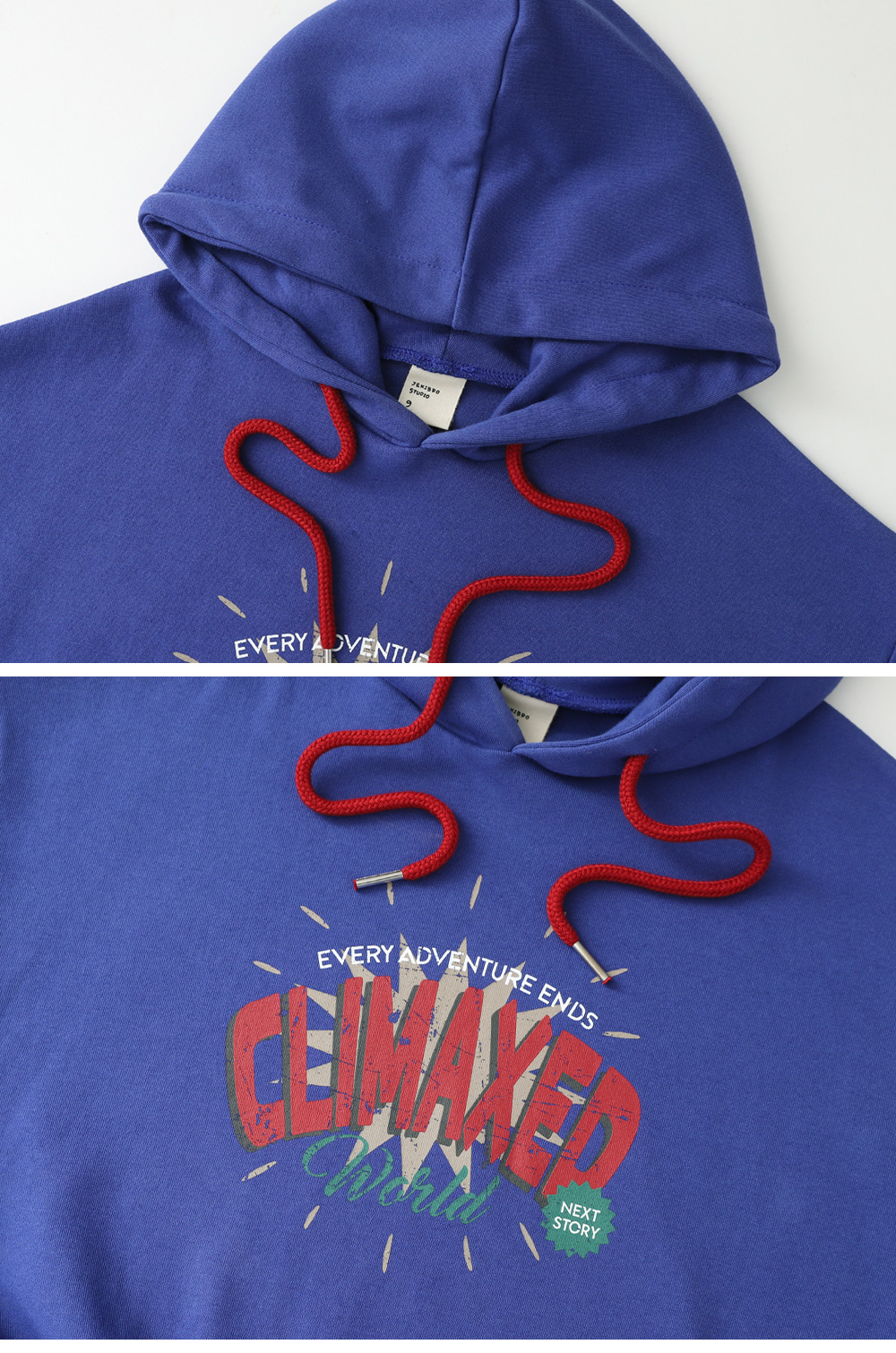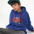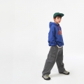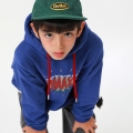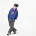 青色&レットカラーの組み合わせでカジュアルに楽しむのに良いフードマンツーマンですよ カンガルーポケットなしでプリントでポイントを与えたアイテムで気にせずコーディネートするのが好きです