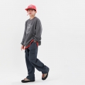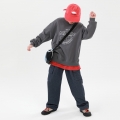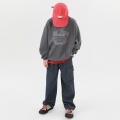 レタリングと裾 レイヤードディテールでポイントを与えたチャコールカラーのマンツーマンとネイビーカラーの一体型カーゴパンツ構成の上下セットアップです。