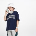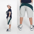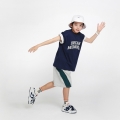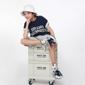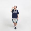 斜線ウーブン配色がポイントでカジュアルな魅力をUPしてくれるハーフパンツとどこでも一緒にやりやすいネイビー半袖ティーシャツ構成の上下セットアップですよ