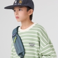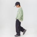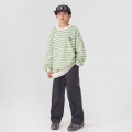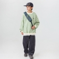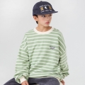 은은한 연두 컬러의 경쾌한 스트라이프 패턴이 돋보이는 맨투맨이에요