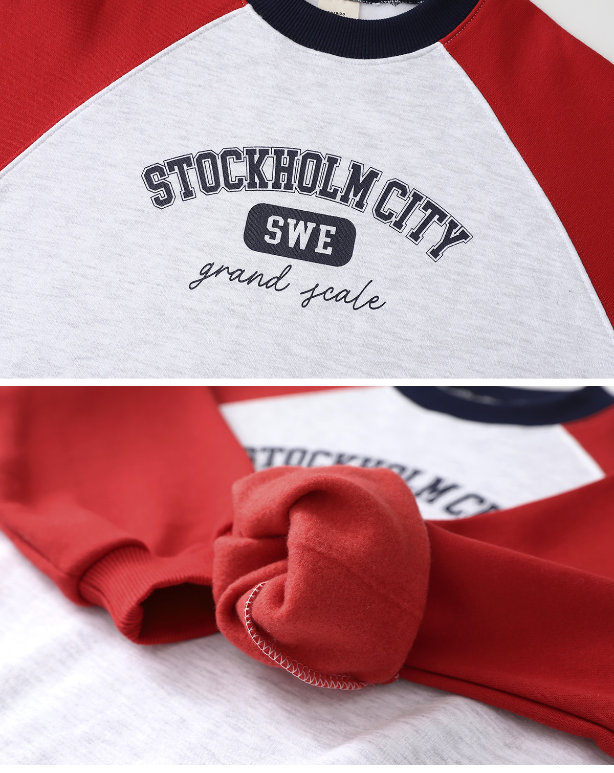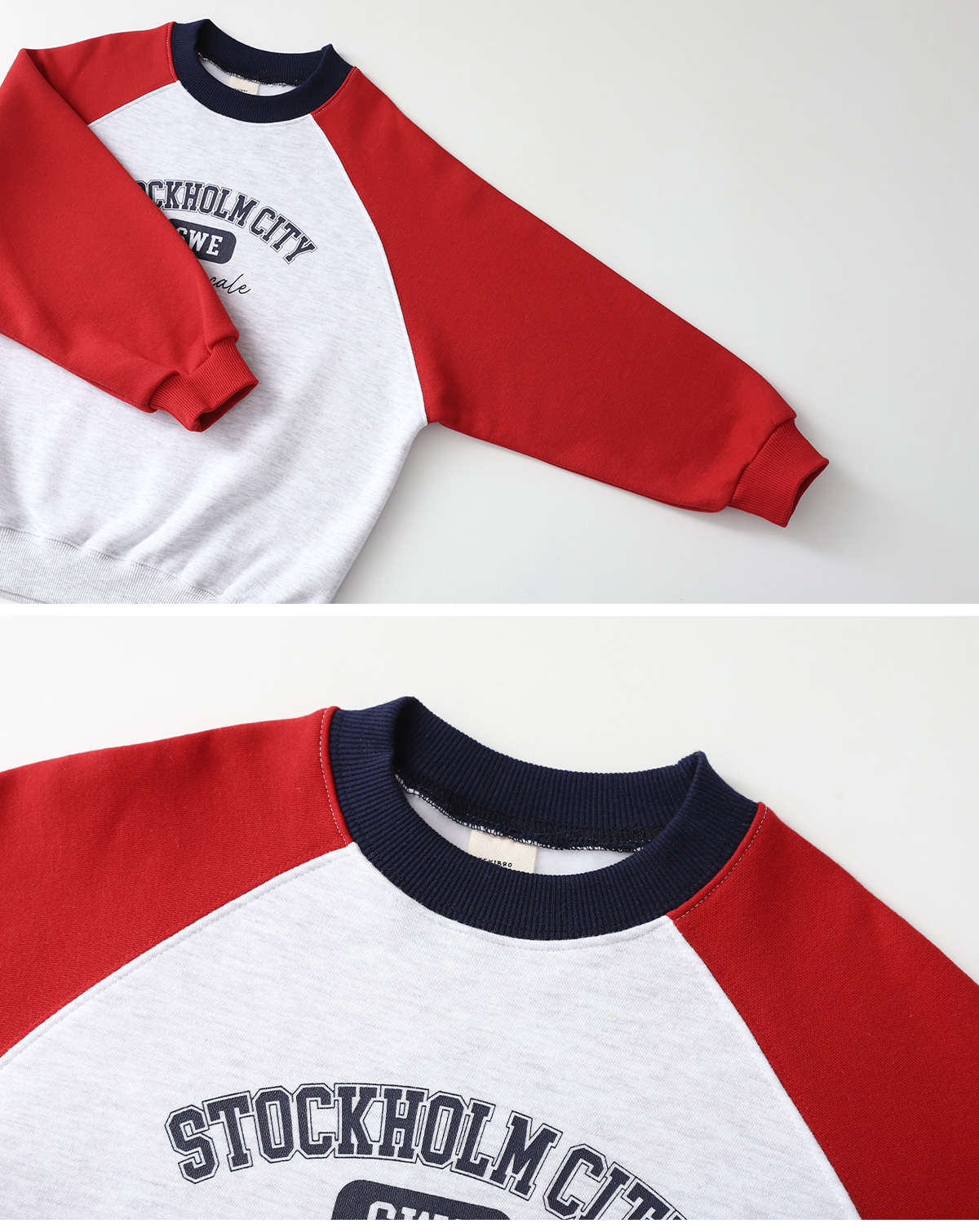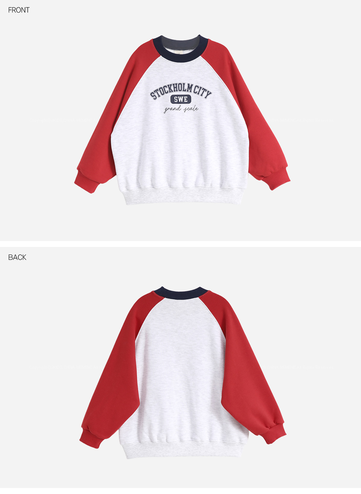화이트멜란지 바탕에 레드 소매가 더해진 기모 맨투맨이에요.