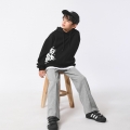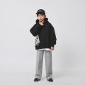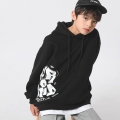きれいなブラックカラーにホワイト汚れでポイントを与えたフードマンツーマンですよデイリーで軽く活用していいです